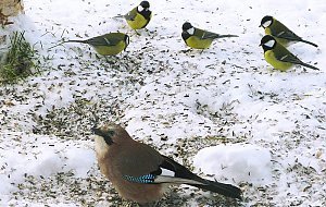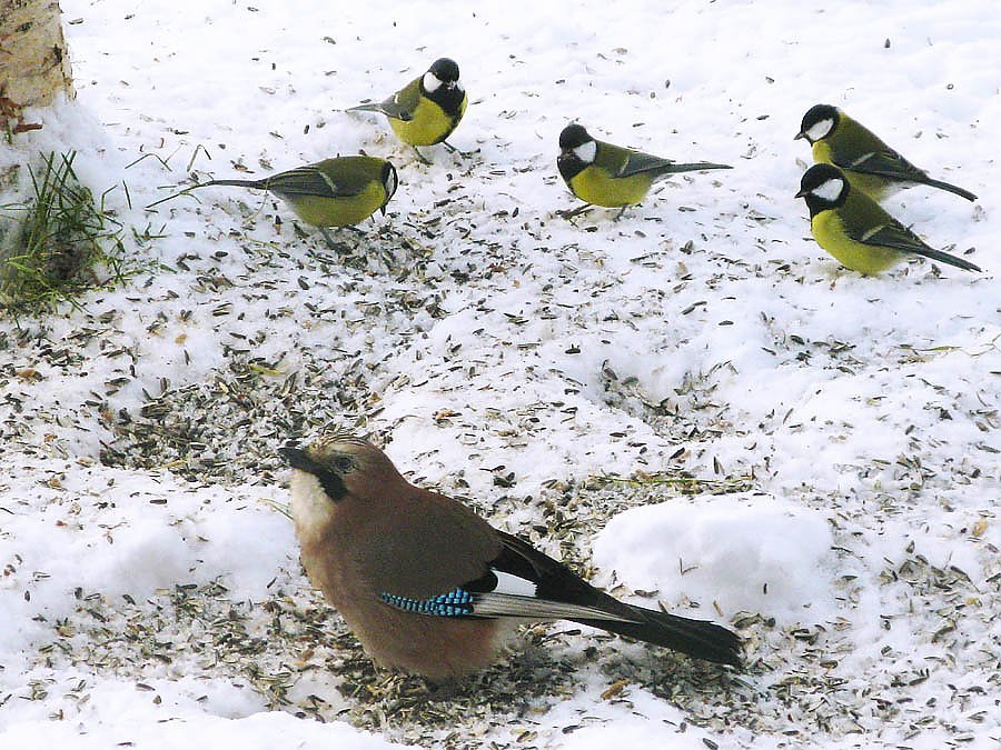 An unserem Vogelfutterplatz gibt es seit einigen Tagen farbenfrohen Zuwachs. Mehrere Eichelhäher tun sich an dem Futter gütlich. Leider sind die Eichelhäher immer nur kurz während ihres Durchzugs bei uns zu Besuch.
