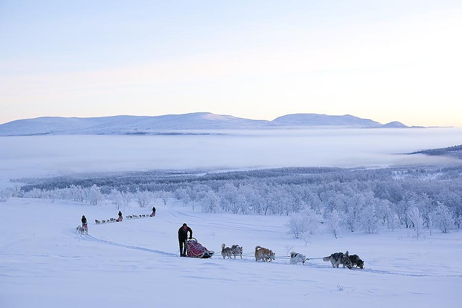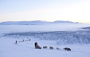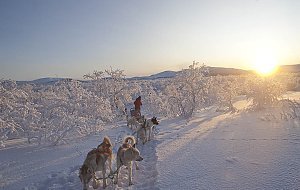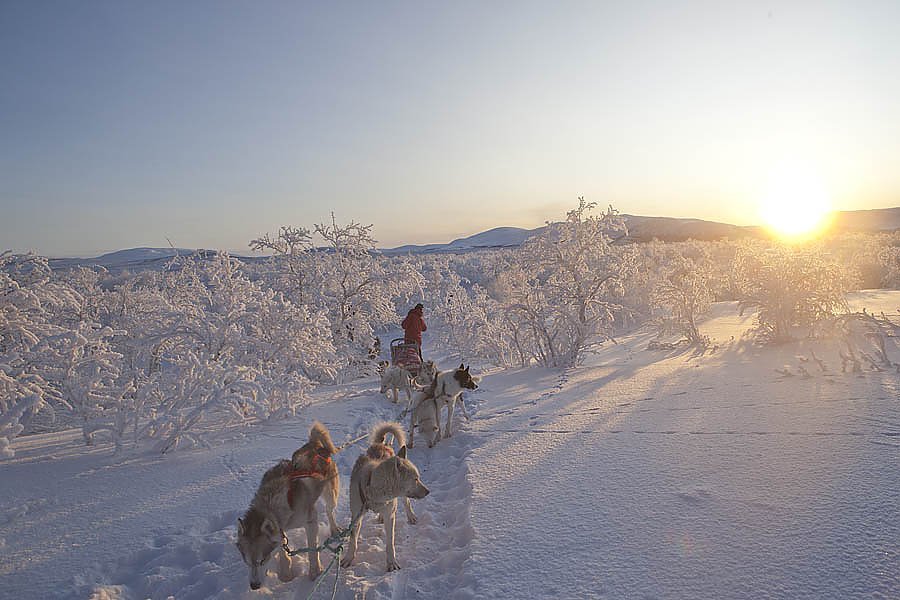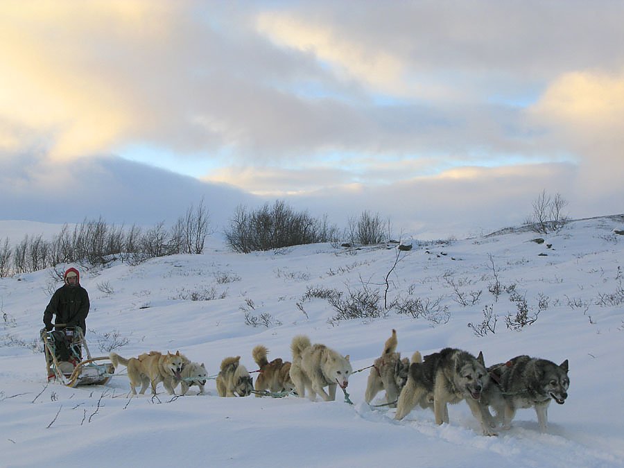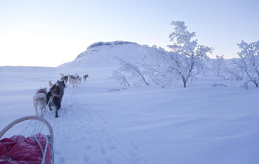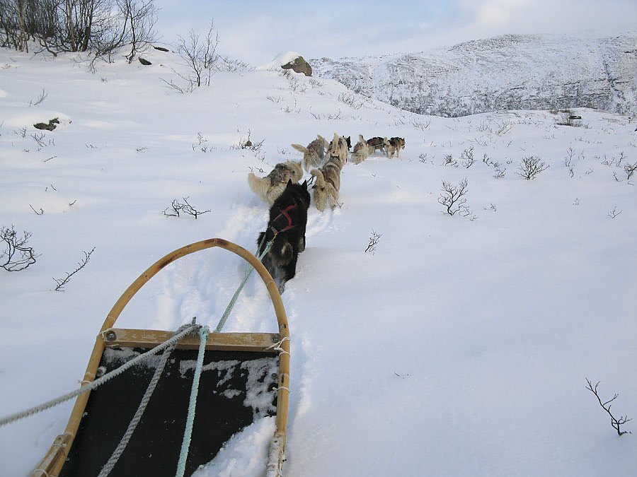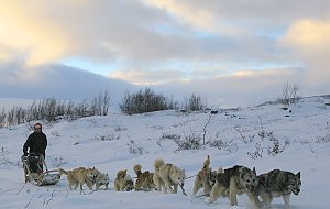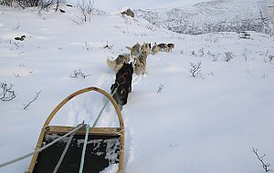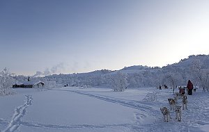 Bei unseren täglichen Trainingstouren mit vier Gespannen sehen wir die Sonne nur noch an den Gipfeln der Berge. Bis hinunter ins Tal scheint sie jetzt nicht mehr. Nun beginnt die Zeit, in der wir das Nordlicht am besten beobachten können. Wir sind gespannt!